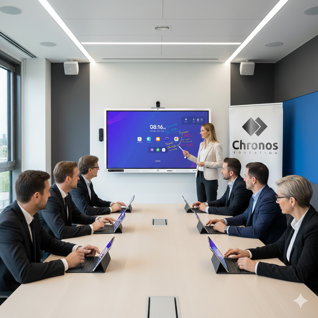 Chronos Education Elite AI - dokonalá harmónia hardvéru a softvéru - čítaj nižšie. Na videu je 65 palcová verzia - pre vás máme 75 palcové displeje.